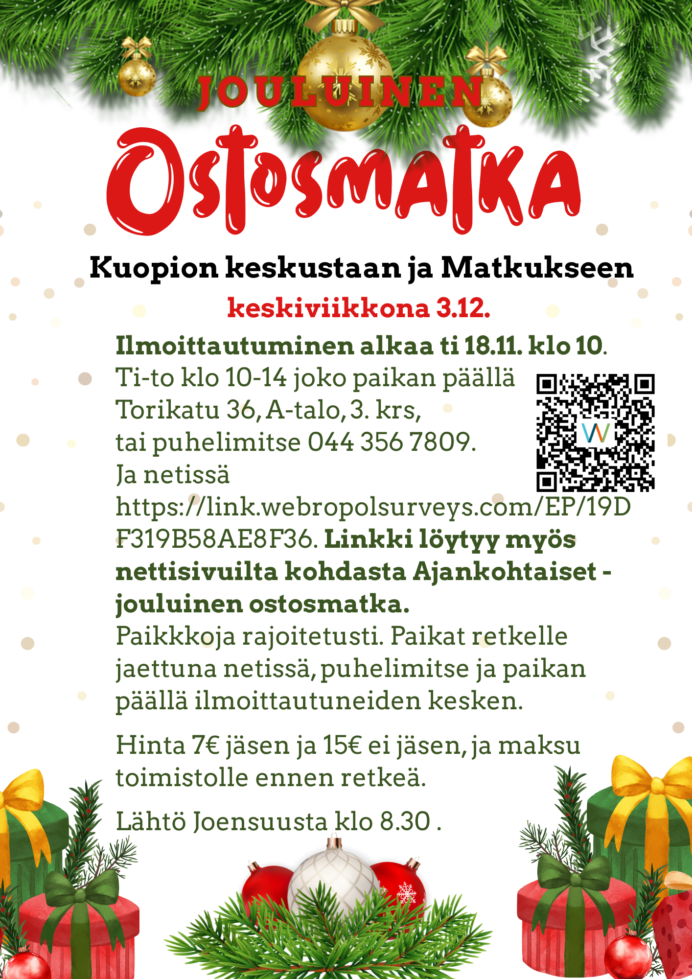 Keskiviikkona 3.12. klo 8.30 lähdemme yhdessä linja-autolla ostosmatkalle Kuopioon. Kyydillä on mahdollista mennä Kuopion keskustaan tai ostoskeskus Matkukseen. Retken hinta on yhdistyksen jäsenelle 7 € ja ei-jäsenelle 15 €. Tällä kertaa paikat retkelle ovat jaossa netissä ja osa paikoista mahdollista varata paikan päällä toimistolla tai puhelimitse (ti-to klo 10-14 p. 044 356 7809). Ilmoittautuminen alkaa ti 18.11. klo 10.