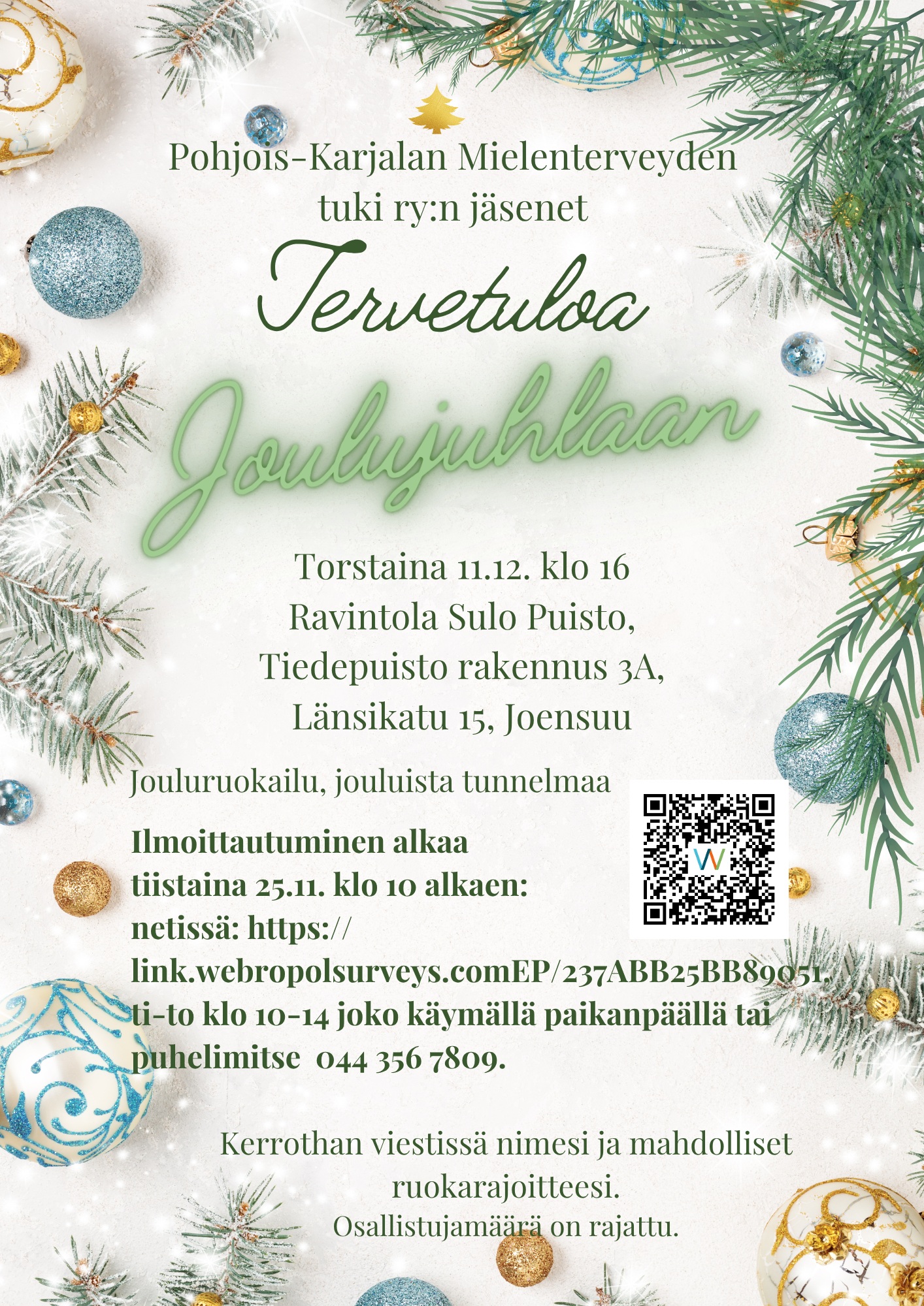 Arvoisat Pohjois-Karjalan Mielenterveydentuki ry:n jäsenet. Tervetuloa yhteiseen joulujuhlaan to 11.12. klo 16 alkaen Tiedepuistolle ravintola Sulo Puistoon. Juhla on maksuton yhdistyksen jäsenille, mutta paikkoja on rajoitetusti. Ohjelmassa on jouluista ohjelmaa, musiikkia ja jouluruokailu. Ilmoittautuminen alkaa ti 25.11. klo 10. Ilmoittautua voit soittamalla p. 044 356 7809 tai käymällä meidän toimistolla paikan päällä tai netissä tästä linkistä, joka avautuu ti 25.11. klo 10 https://link.webropolsurveys.com/EP/237ABB25BB89051D