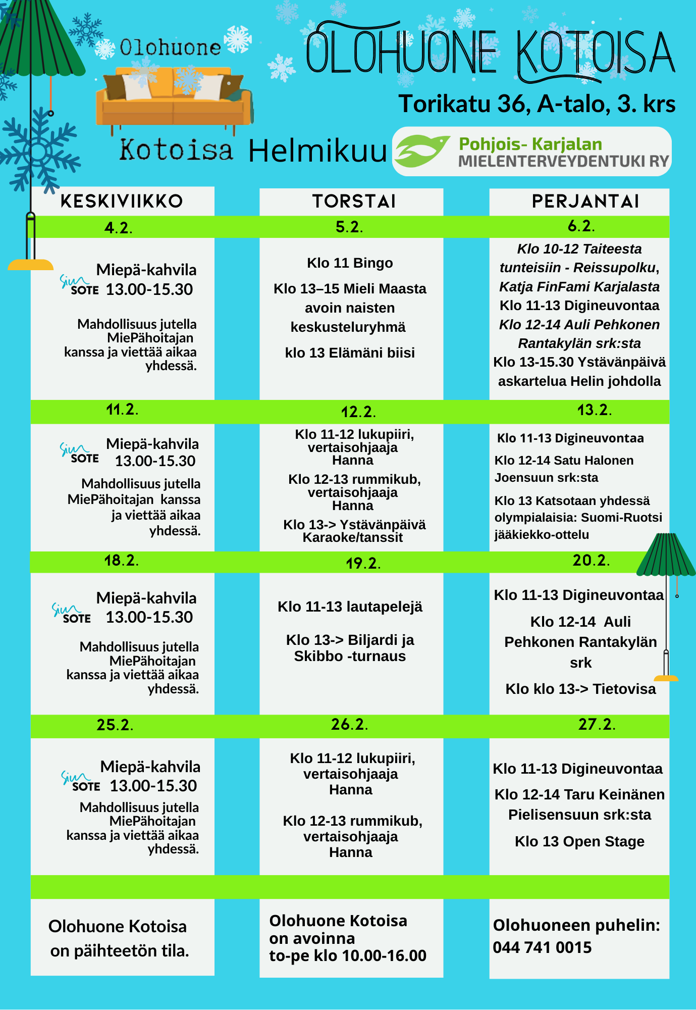Kohtaamispaikka Olohuone Kotoisa on avoinna torstaisin klo 10.00-16.00 ja perjantaisin klo 10.00-16.00.