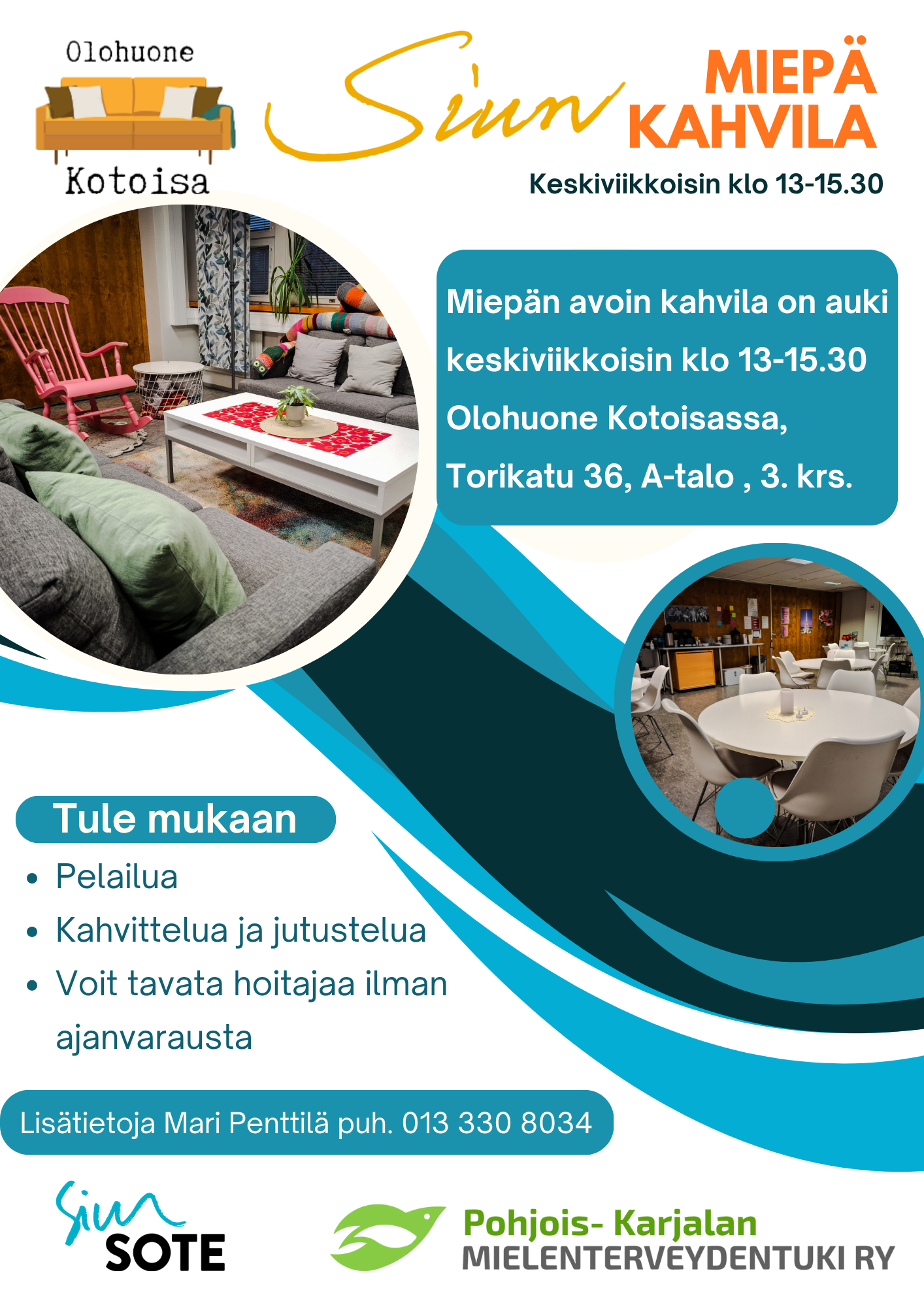 Miepä-kahvila Olohuone Kotoisalla keskiviikkoisin klo 13-15.30 mennessä MieTe | marras 13, 2025 | Ajankohtaista Edellinen postaus Joulujuhla to 11.12. Saatat tykätä myös Joulujuhla to 11.12. Onko pihasi syystoimet vielä tekemättä, tilaa Wörkkis avuksi Jouluinen ostosmatka Kuopioon ke 3.12. Haku: