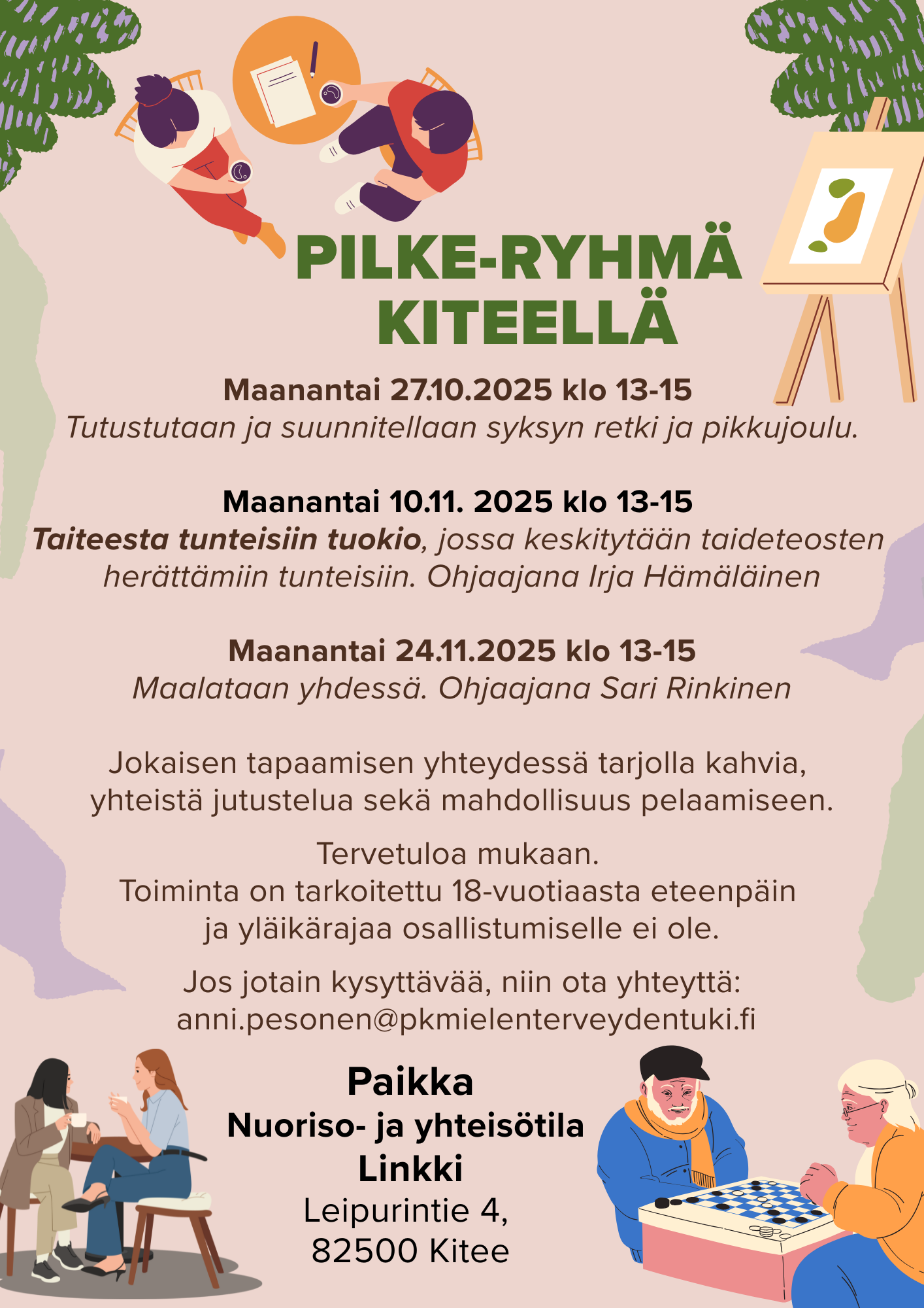 Tervetuloa mukaan Pilke-ryhmään. Ryhmä kokoontuu maanantaisin klo 13-15 Kiteellä nuoriso- ja yhteisötila Linkissä Leipurintie 4. Toiminta on tarkoitettu yli 18-vuotiaille, ei yläikärajaa. Jokaisella kerralla on tarjolla kahvia, yhteistä jutustelua ja pelaamista. Ensimmäisellä kerralla ma 27.10. suunnitellaan syksyn retkeä ja pikkujoulua. Lisätiedot: anni.pesonen@pkmielenterveydentuki.fi