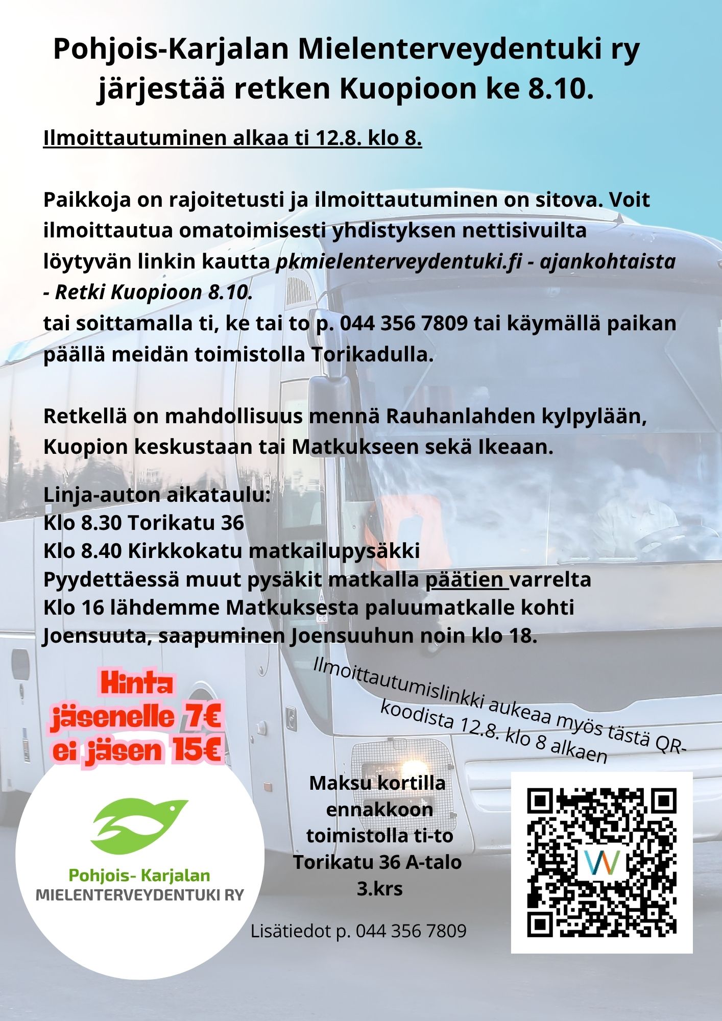 Pohjois-Karjalan Mielenterveydentuki ry järjestää retken Kuopioon ke 8.10. Voit mennä Kuopion keskustaan, Rauhanlahden kylpylään tai kauppakeskus Matkukseen. Retken hinta on yhdistyksen jäsenille 7 euroa ja ei-jäsenille 15 euroa. Maksu suoritetaan toimistolla kortilla ennen retkeä. Ilmoittautuminen retkelle alkaa ti 12.8. Voit ilmoittautua omatoimisesti netissä alla olevasta ilmoittautumislinkistä tai voit soittaa p. 044 356 7809 tai voit tulla käymään paikan päällä meidän toimistolla ti-to klo 10-14 (Torikatu 36 A 3.krs.).