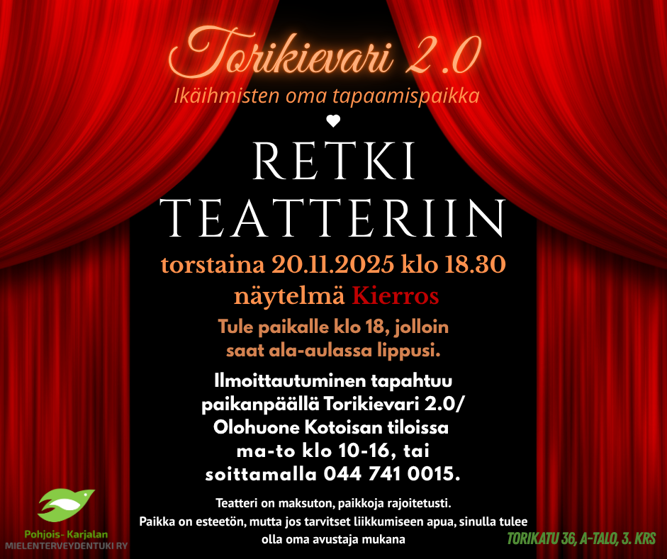 Teatteriretki ToriKievarin kävijöille to 20.11. mennessä MieTe | loka 23, 2025 | Ajankohtaista ToriKievari tekee to 20.11. retken teatteriin katsomaan näytelmää Kierros. Teatteri on maksuton ja paikkoja on rajoitetusti. Ilmoittautuminen ToriKievarin ohjaajalle paikanpäällä tai p. 044 741 0015. Edellinen postaus Pilke-ryhmä Kiteellä Saatat tykätä myös Pilke-ryhmä Kiteellä Syyskokous ti 11.11. klo 18 Olohuone Kotoisalla Kirsi Piiparinen on 1.10.2025 aloittanut uutena toiminnanjohtajana Haku: