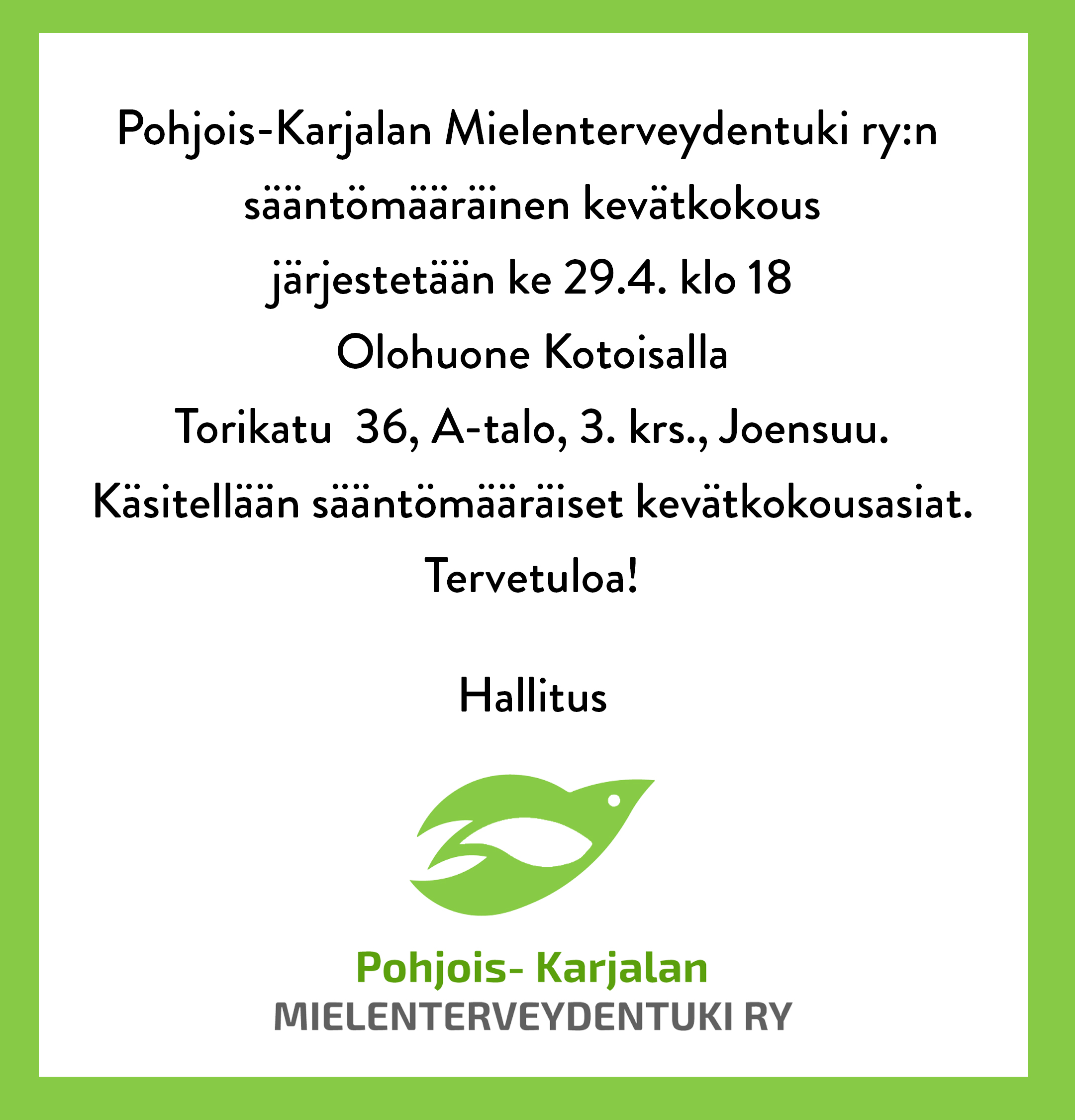 Pohjois-Karjalan Mielenterveydentuki ry:n sääntömääräinen kevätkokous järjestetään ke 29.4.2026 klo 18 alkaen Olohuone Kotoisalla Torikatu 36 A-talo 3.krs Joensuu. Kokouksessa käsitellään sääntömääräiset asiat. Tervetuloa!